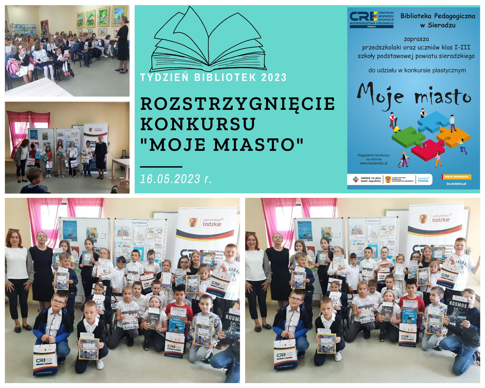 12 i 16 maja w CREWŁ w Sieradzu Bibliotece Pedagogicznej w Sieradzu odbyło się uroczyste rozdanie nagród w powiatowym konkursie „Moje miasto” w kategorii grup przedszkolnych i klas I-III szkół podstawowych. Konkurs realizowany jest w ramach zadania z Budżetu Obywatelskiego „Łódzkie na plus” na rok 2023 pod nazwą „Dobrze znać”. Celem konkursu było: poznawanie historii i dziedzictwa kulturowego miasta Sieradza, poznanie i popularyzacja wśród uczestników atrakcji turystycznych miasta Sieradza.
